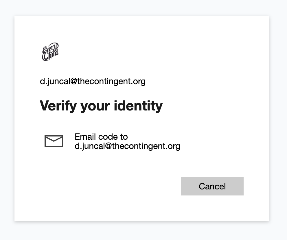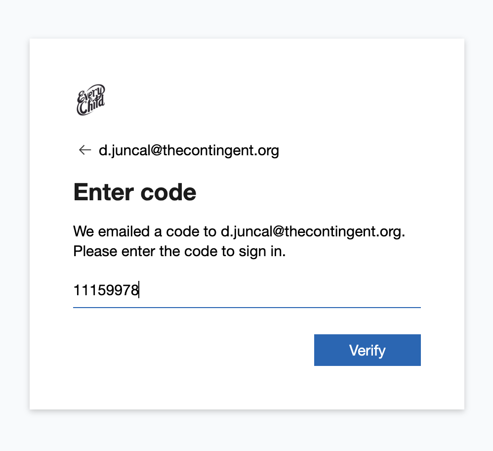 - You will receive an email with a subject like "Your Every Child Portal account verification code” from “Every Child Portal (via Microsoft)” with a numeric code. Go to your email inbox, copy the code, and paste that numeric code to the website and click “Verify"