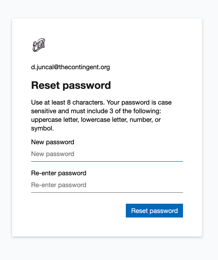 - Create a new password. Make sure it includes 3 of the following: uppercase letter, lowercase letter, number, or symbol. Click “Reset password”
